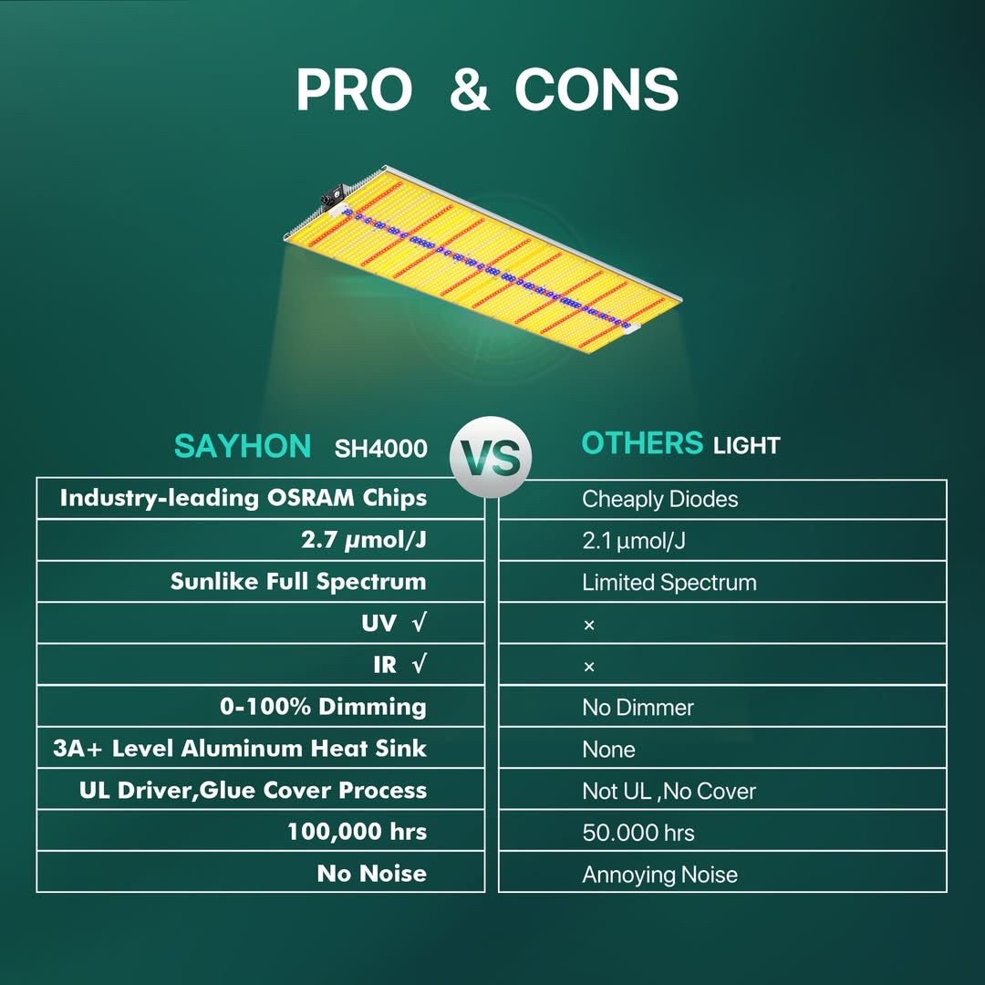 - KAUFEN SIE MIT VERTRAUEN: Die OSRAM-LED-Chips und der UL-gelistete Treiber der SAYHON-Serie gewährleisten höchste Qualität und Sicherheit. Plug and Play. Wir bieten eine sorgenfreie 36-monatige lokale Garantie und professionelle Beratung, damit Sie und Ihre Pflanzen besser wachsen